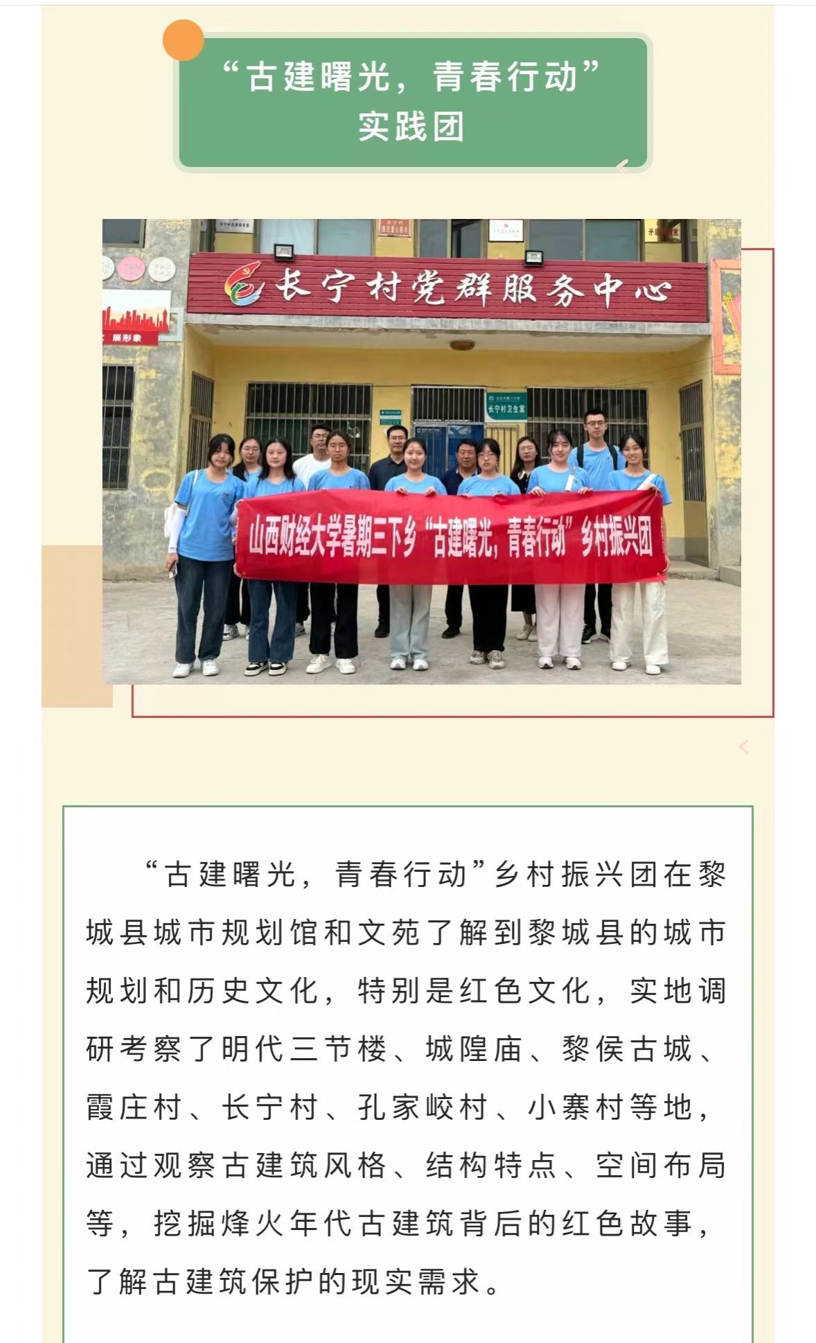 “古建曙光,青春行动”乡村振兴团在黎城县城市规划馆和文苑了解到黎城县的城市规划和历史文化,特别是红色文化,实地调研考察了明代三节楼、城隍庙、黎侯古城、霞庄村、长宁村、孔家峧村、小寨村等地,通过观察古建筑风格、结构特点、空间布局等,挖掘烽火年代古建筑背后的红色故事,了解古建筑保护的现实需求。