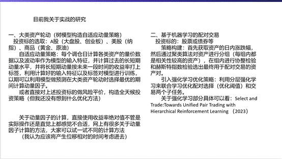 张晋玮同学以《基于CEEMD-CNN-LSTM的股票指数集成预测模型》为主题进行分享, 文章利用CEEMD对沪深300收盘点数进行了分解,得到了7个IMF分量和1个残余分量,后续通过游程判定法对IMF进行了合并。张晋玮同学分享过程中最大的特点是加入了非常多的个人关于量化研究的观点思考,结合了自己的实习经历,分享了关于自适应动量策略、基于机器学习的配对交易以及机器选股方面的研究进程。苏老师对张晋玮同学分享中的巧思给予了充分肯定,并对其之后关于机器学习方面的研究提出了相关建议。