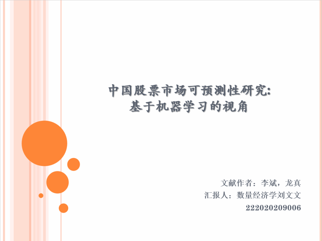 “股票市场收益率和波动率的准确预测是金融学术界和实务界均关注的重要问题。常见的线性模型存在着模型误设和参数不稳定的问题,难以有效预测风险溢价。因此,从全新的视角审视并探究中国股票市场的可预测性问题显得尤为重要。”刘文文同学以《中国股票市场可预测性研究:基于机器学习的视角》为主题进行分享。文章从机器学习的视角出发,基于1996年1月—2019年12月的数据,构建提升回归树(BRT)模型对股市收益率与波动率进行样本外预测,并与传统方法进行了对比。继而分析提升回归树预测能力的来源,最后构建了最优风险资产配置策略,研究其预测是否给投资者带来收益与效用构建了最优风险资产配置模型,为股票市场风险溢价问题的研究提供了全新的视角。